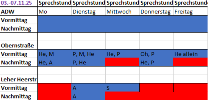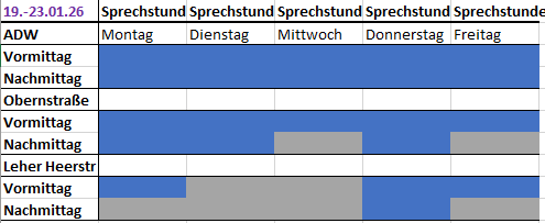 In den unteren Tabellen können Sie jeweils sehen, wann welche Praxen in den nächsten Wochen geöffnet bzw. geschlossen sind.